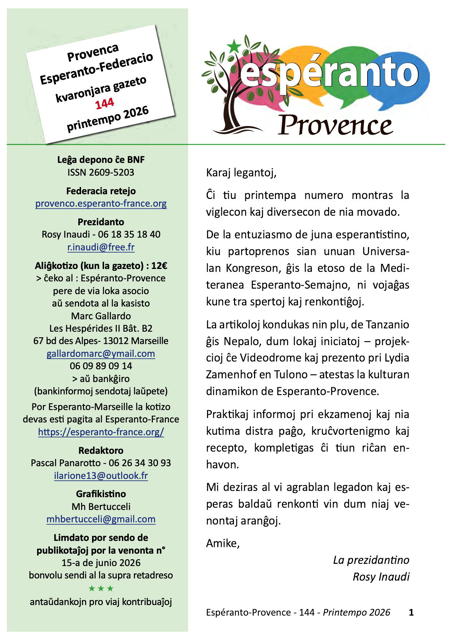 cet article en espéranto : Aktuala numero de nia kvaronjara gazeto : 144 - printempo 2026